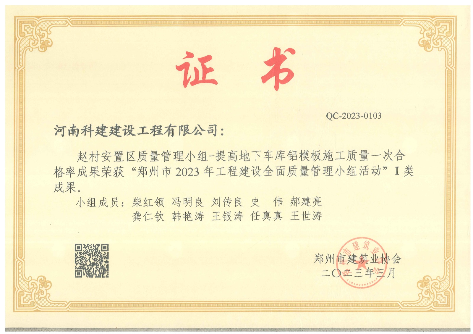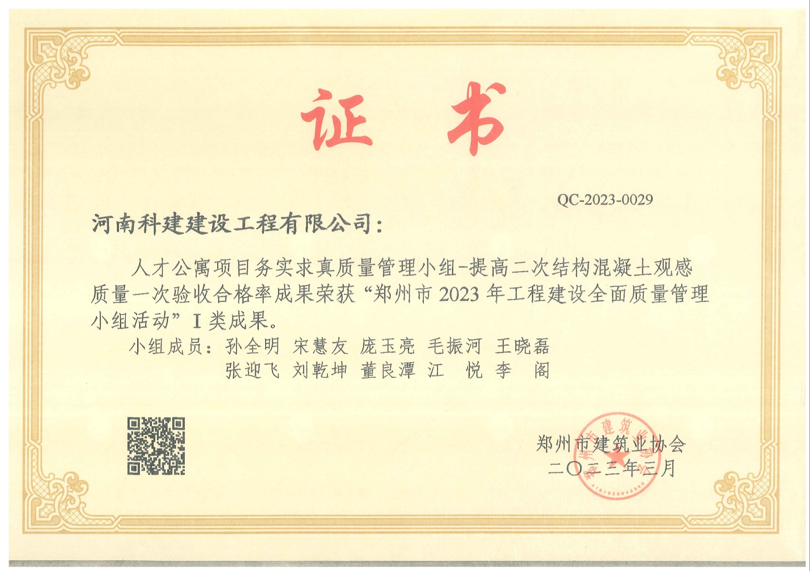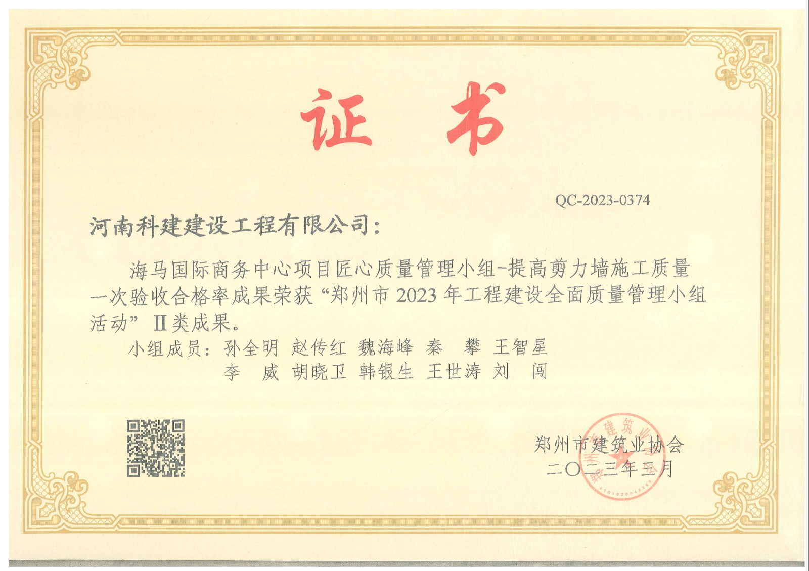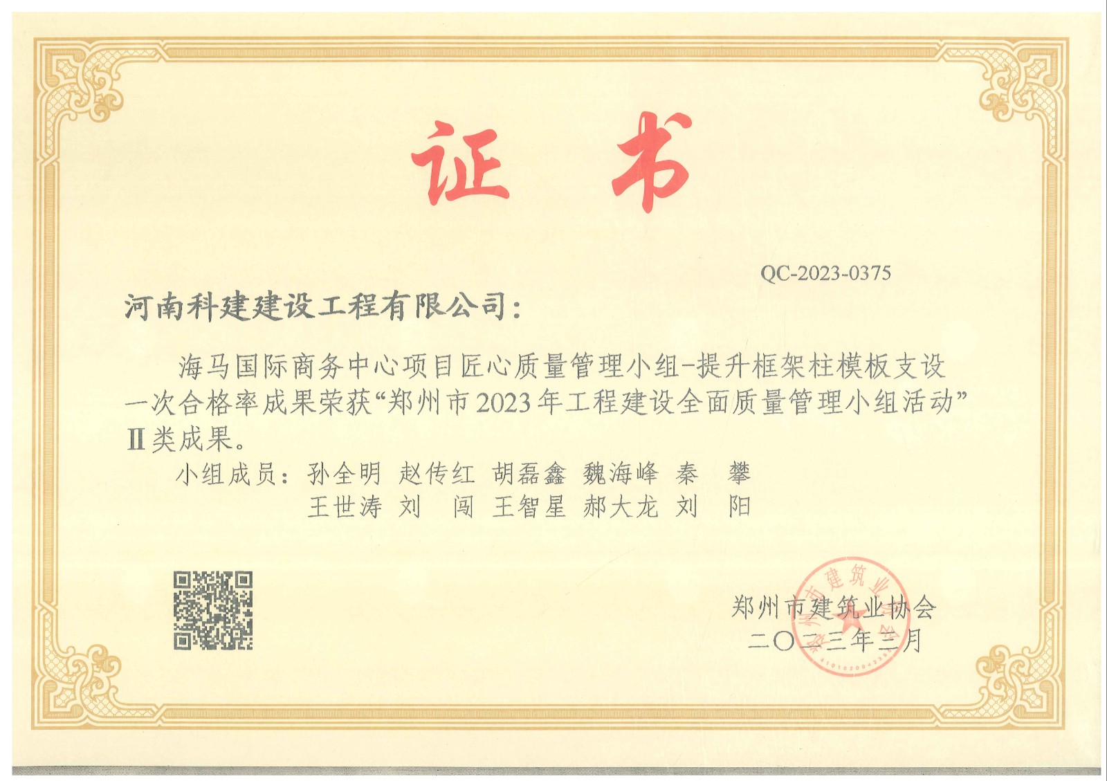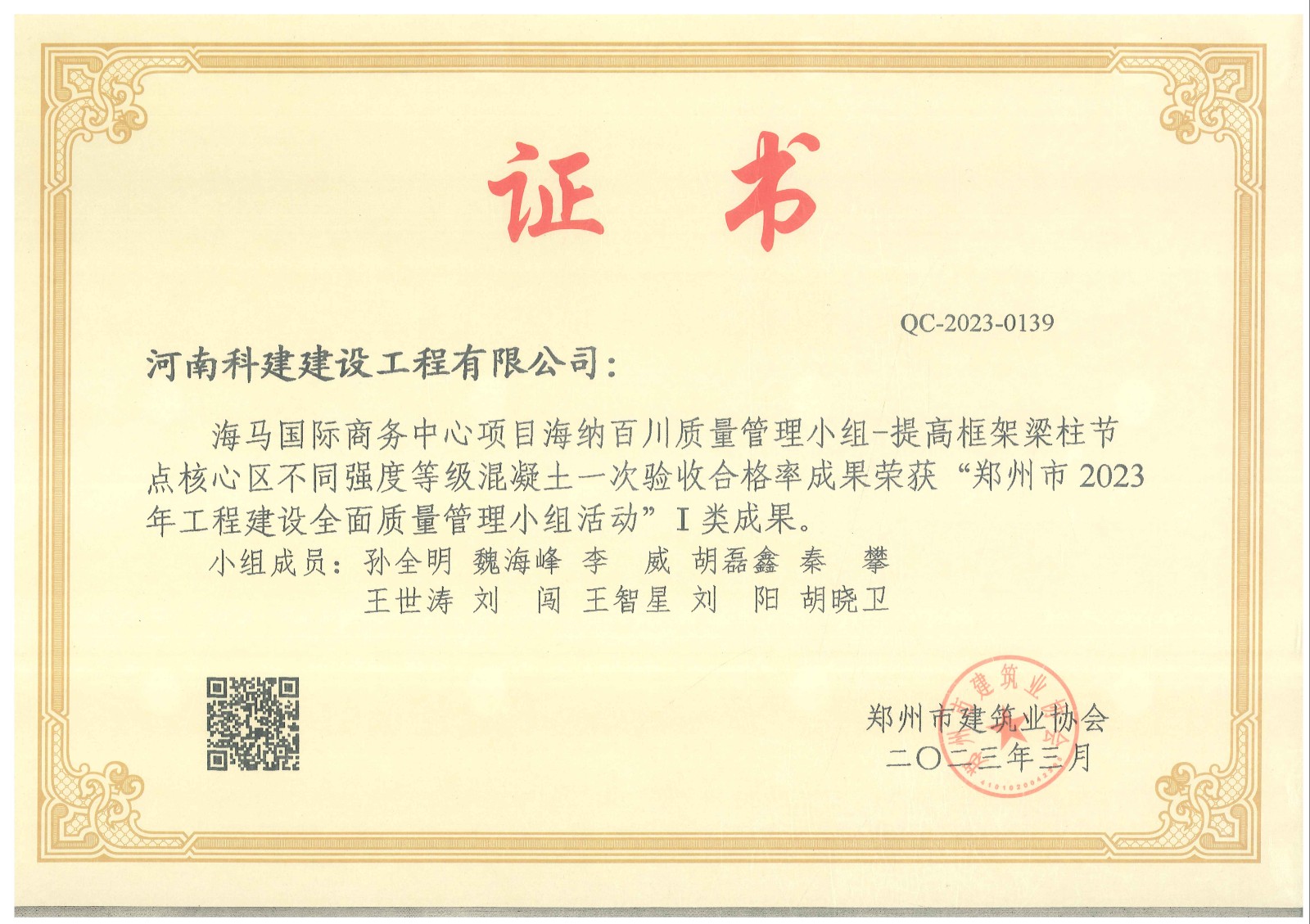 最终我公司海马国际商务中心项目荣获郑州市2023年完美中国官网建设全面质量管理优秀QC成果一类成果奖1项,二类成果奖2项。恒大赵村安置区项目荣获一类成果奖1项。经开区人才公寓项目项目荣获一类成果奖1项。